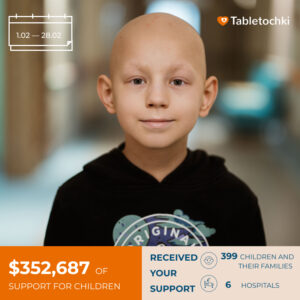 — $15,604 was spent on psychological assistance for 125 families. Tabletochki provides psychological support not only to the child who is ill but also to their parents and, if necessary, to siblings. The fight against cancer affects the whole family. Psychologists help them cope with the effects of prolonged stress and find the strength to move on.